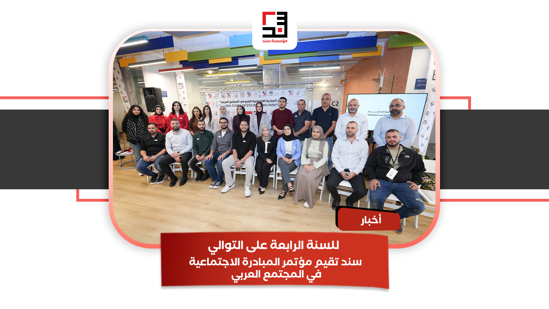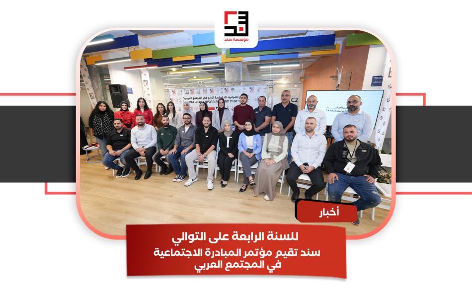 نظّمت مؤسسة "سند" للبنية التحتية التنظيمية في المجتمع العربي، يوم الجمعة الموافق 28/11/2025، مؤتمر المبادرة الاجتماعية الرابع، بمشاركة واسعة من الأعضاء والمتطوعين في المجتمعات المنظمة المحلية بالشبكة، كذلك الحاصلين على المنح الأكاديمية، المبادرين الحاصلين على المنح للمشاريع المجتمعية، والهيئات الشريكة من القطاعين العام والخاص.